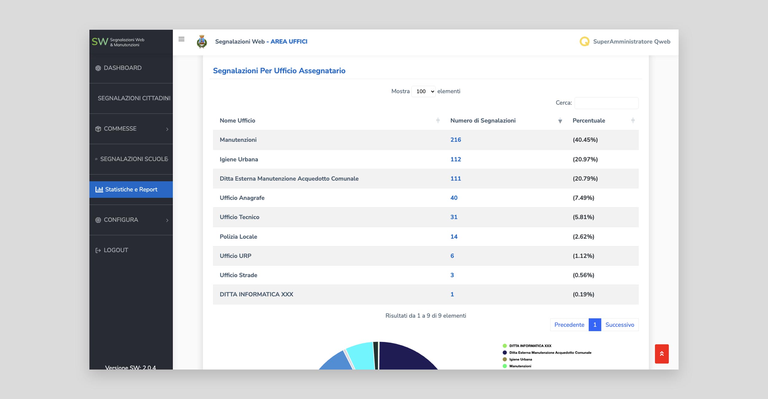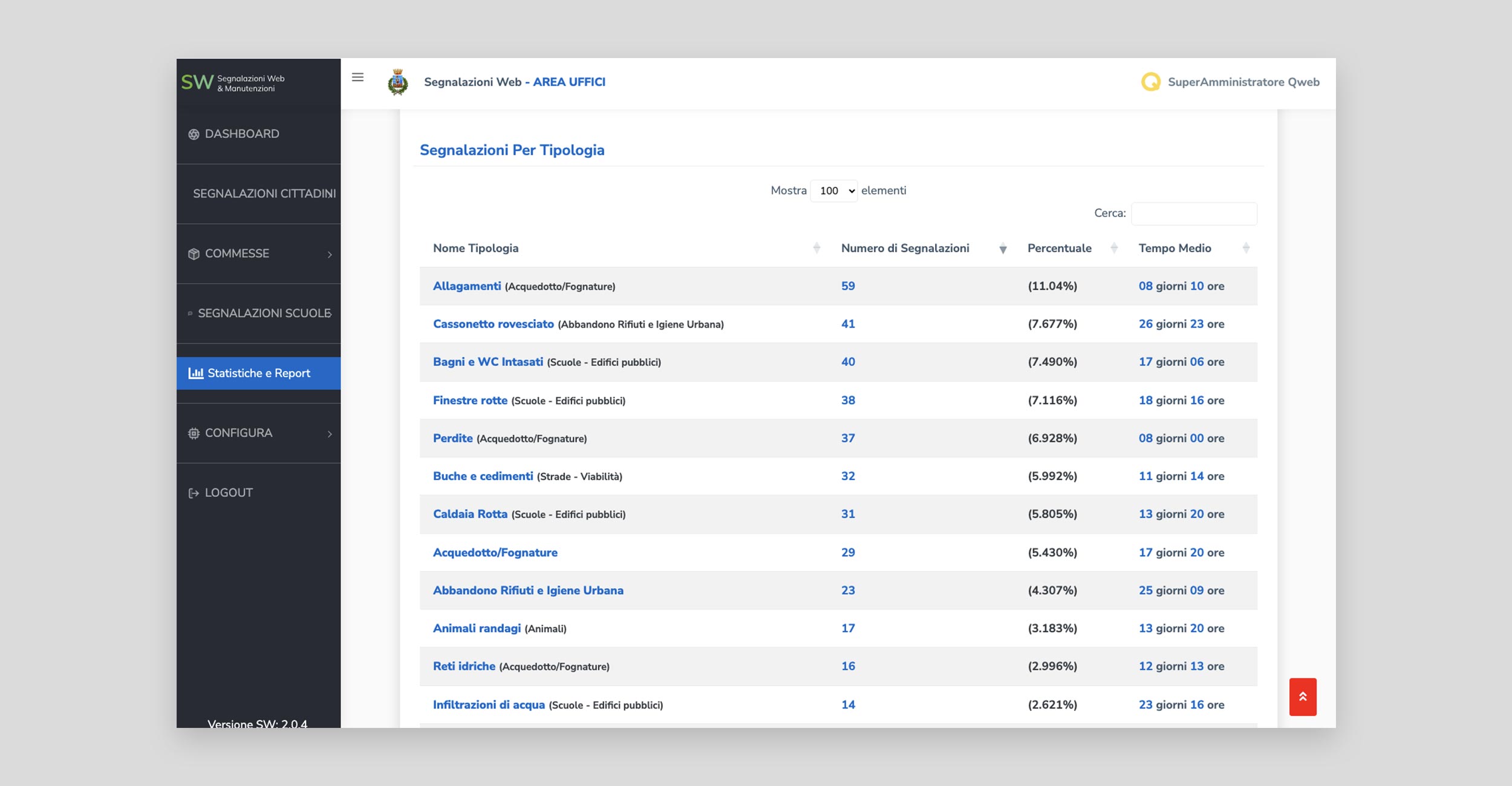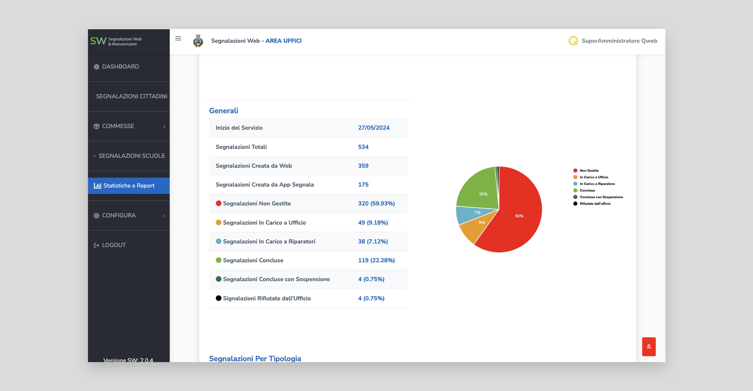 Questi dati statistici permettono di capire dove sono le maggiori criticità e di sollecitare la risoluzione delle segnalazioni aperte, con possibilità di filtrare le statistiche per periodo di riferimento.